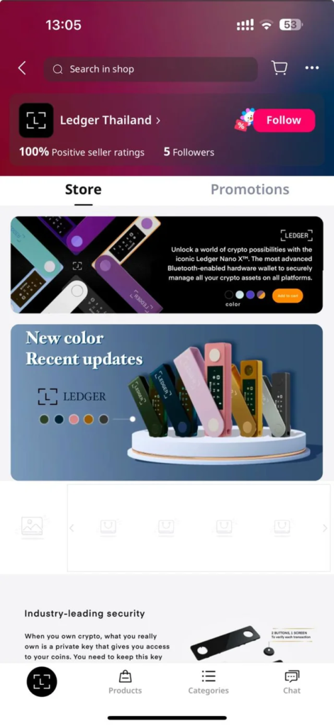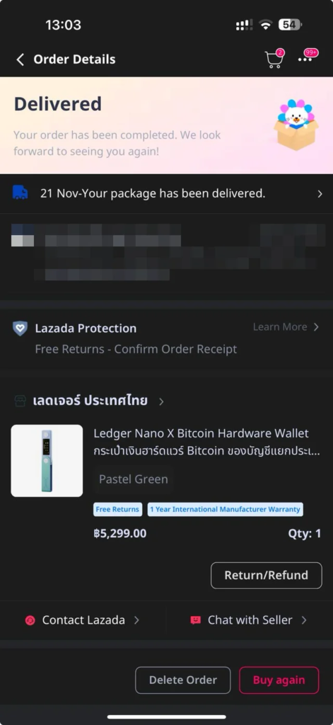 November 21, 2024 – The victim purchased a brand-new Ledger Nano X from what appeared to be a legitimate store on Lazada, Southeast Asia’s equivalent of Amazon. The store was branded as “Ledger Thailand” and featured polished reviews, creating a convincing illusion of authenticity.